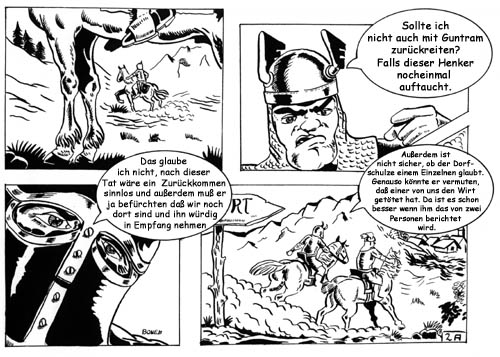 Die drei Männer, die auf so seltsame Weise zusammengefunden hatten, beschlossen zunächst den Wirt zu beerdigen und in der nächsten Ortschaft den Dorfschulzen von dem heimtückischen Mord zu informieren. Dann aber wollten sie unbedingt den maskierten Bogenschützen finden und das Rätsel des leisen Henkers lösen, so wie es einst auch Sigurd gemacht hätte.